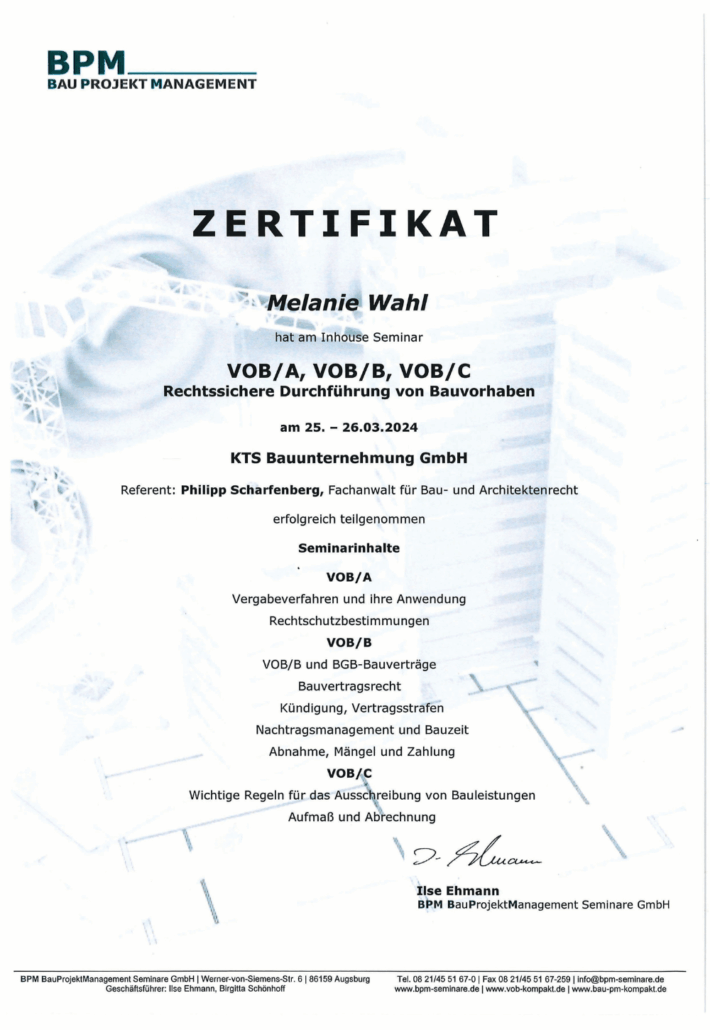 Melanie Wahl bringt 36 Jahre Berufserfahrung in der Bauwirtschaft mit und vereint Praxiswissen mit strategischem Denken und organisatorischer Stärke. Ihre Fähigkeit, komplexe Bau- und Unternehmensprozesse ganzheitlich zu überblicken und effizient zu steuern, macht sie zu einer außergewöhnlich wertvollen Mentorin und Beraterin für die nächste Generation in der Baubranche.